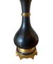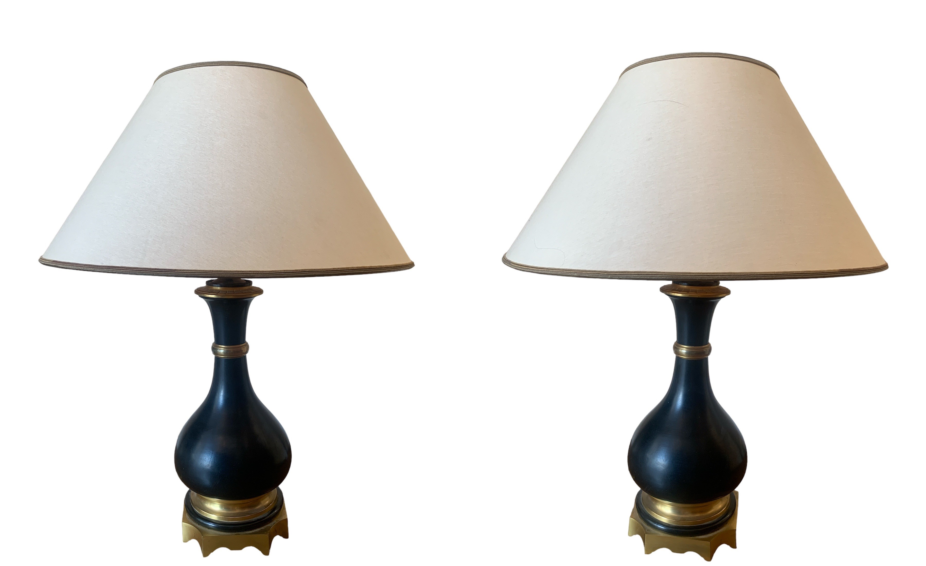 Paire de lampes en métal noir et laiton, les bases octogonales avec découpes évasées, les corps en forme de vase. Début XXème siècle. Bon état, quelques taches d'usures sur les abats-jours. H : 45 cm (60 cm avec abat-jour) L : 15.5 cm (45 cm avec abat-jour)