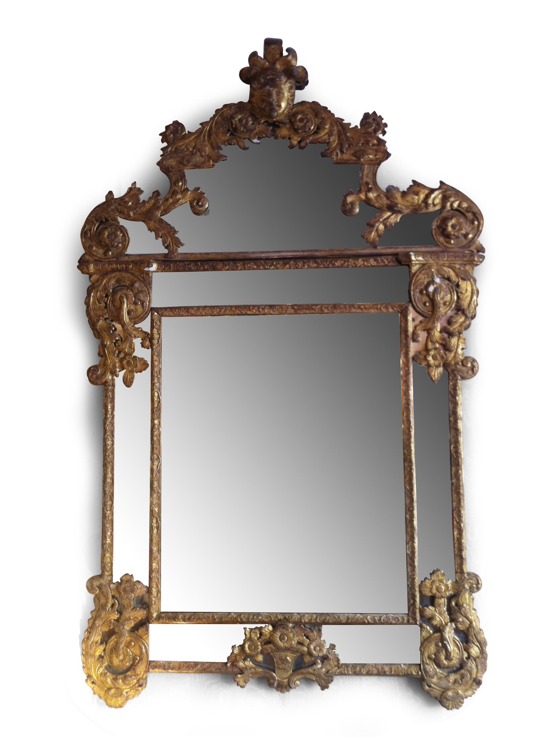 Superbe miroir à parcloses, d'époque Régence, en bois doré, richement sculpté, à décor de fleurs et de rinceaux.