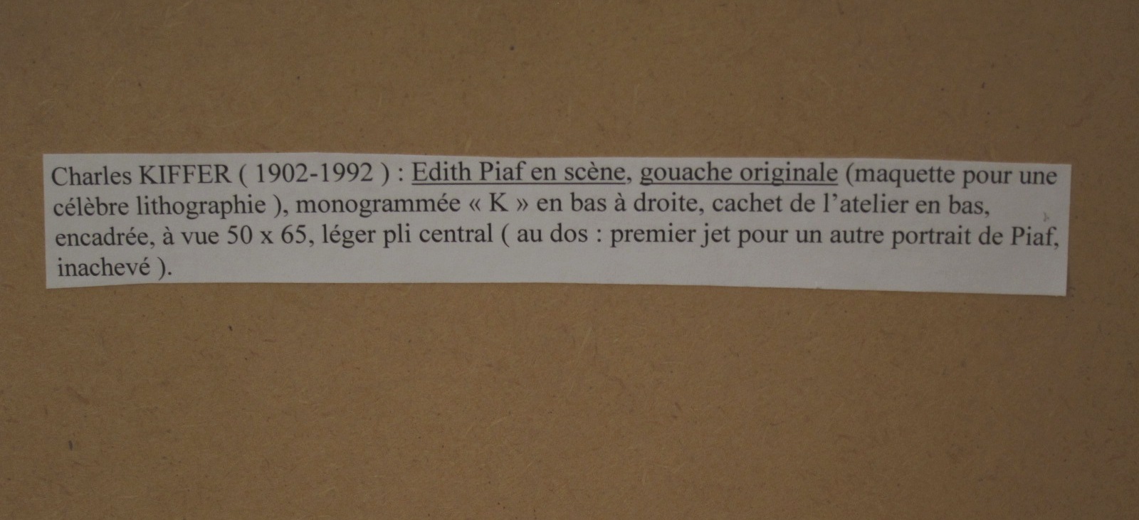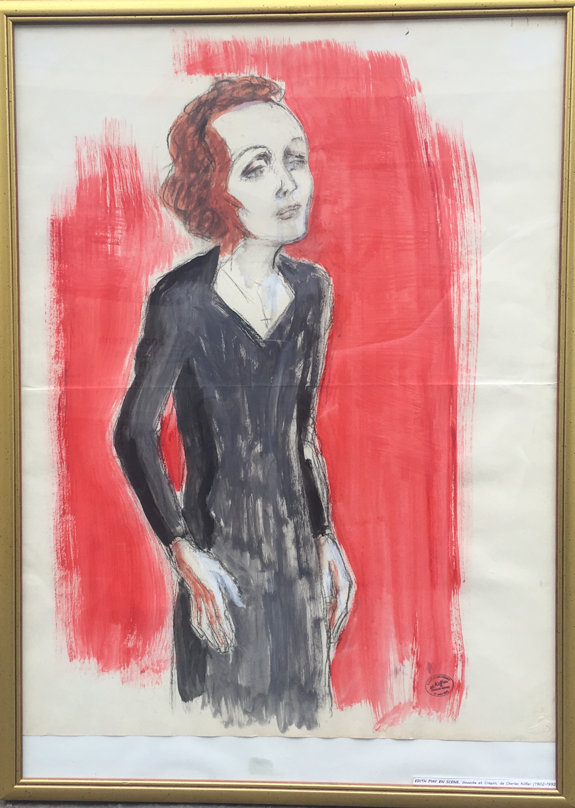 EDITH PIAF EN SCENE, Gouache et Crayon sur papier, maquette pour une célèbre Lithographie de Charles Kiffer (1902-1992), monogramme K et cachet de l’atelier.
