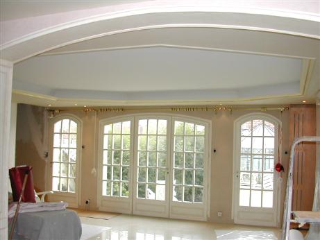 La large corniche moulurée réalisée en staff, intègre l'éclairage avec spots et becs lumineux. Le décor, à effet de patine parcheminée pour le plafond, est rehaussé de filets dorés à la feuille.