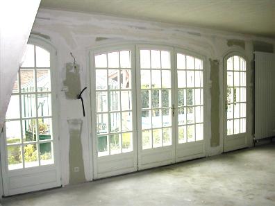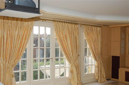 Les rideaux sont en taffetas de soie, molletonnés, à décor de feuillages jaunes et dorés les passementeries en soie ont été spécialement réalisées à la couleur du tissu la tenture murale est spécialement conçue pour une parfaite isolation phonique, de par l'application au dos d'une enduction acrylique floquée.