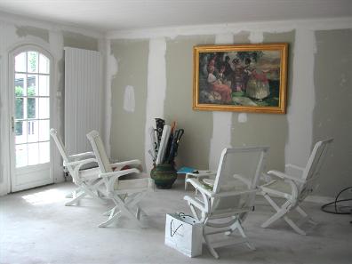 La large corniche moulurée réalisée en staff, intègre l'éclairage avec spots et becs lumineux. Le décor, à effet de patine parcheminée pour le plafond, est rehaussé de filets dorés à la feuille.